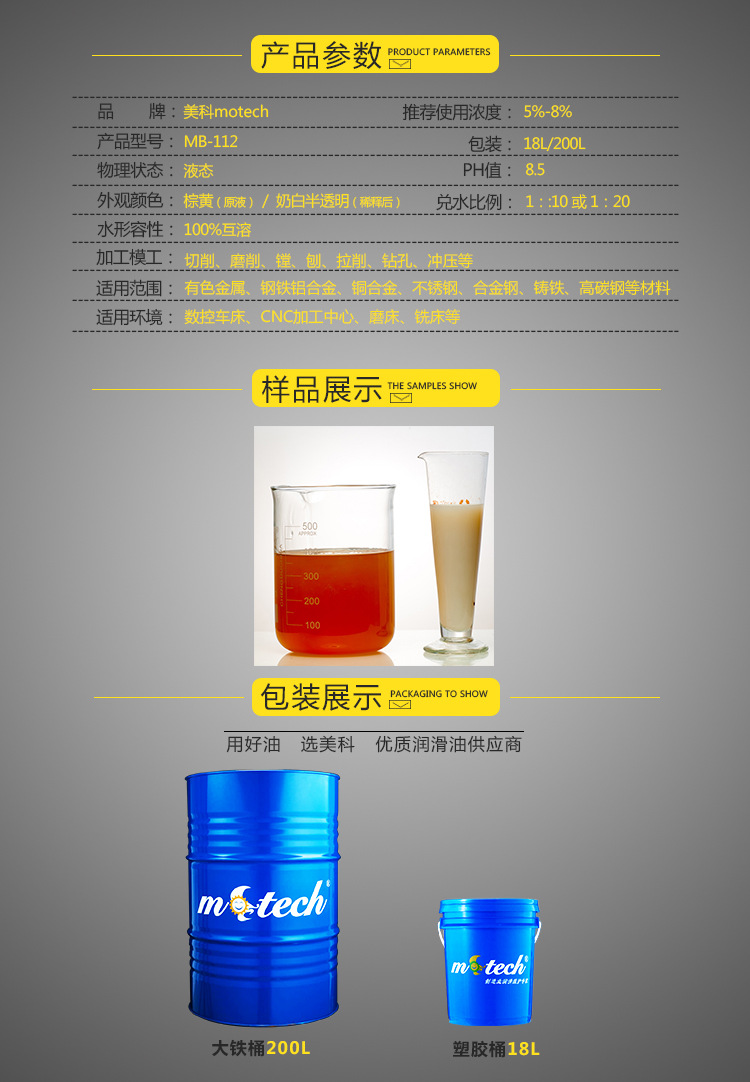 美科?MB 112高防銹乳化切削液,適用于黑色金屬機械加工包括:車削、鉆孔、攻絲、鉸孔、切齒和拉削。在許多加工操作中、可以代替純油進行重負荷加工。